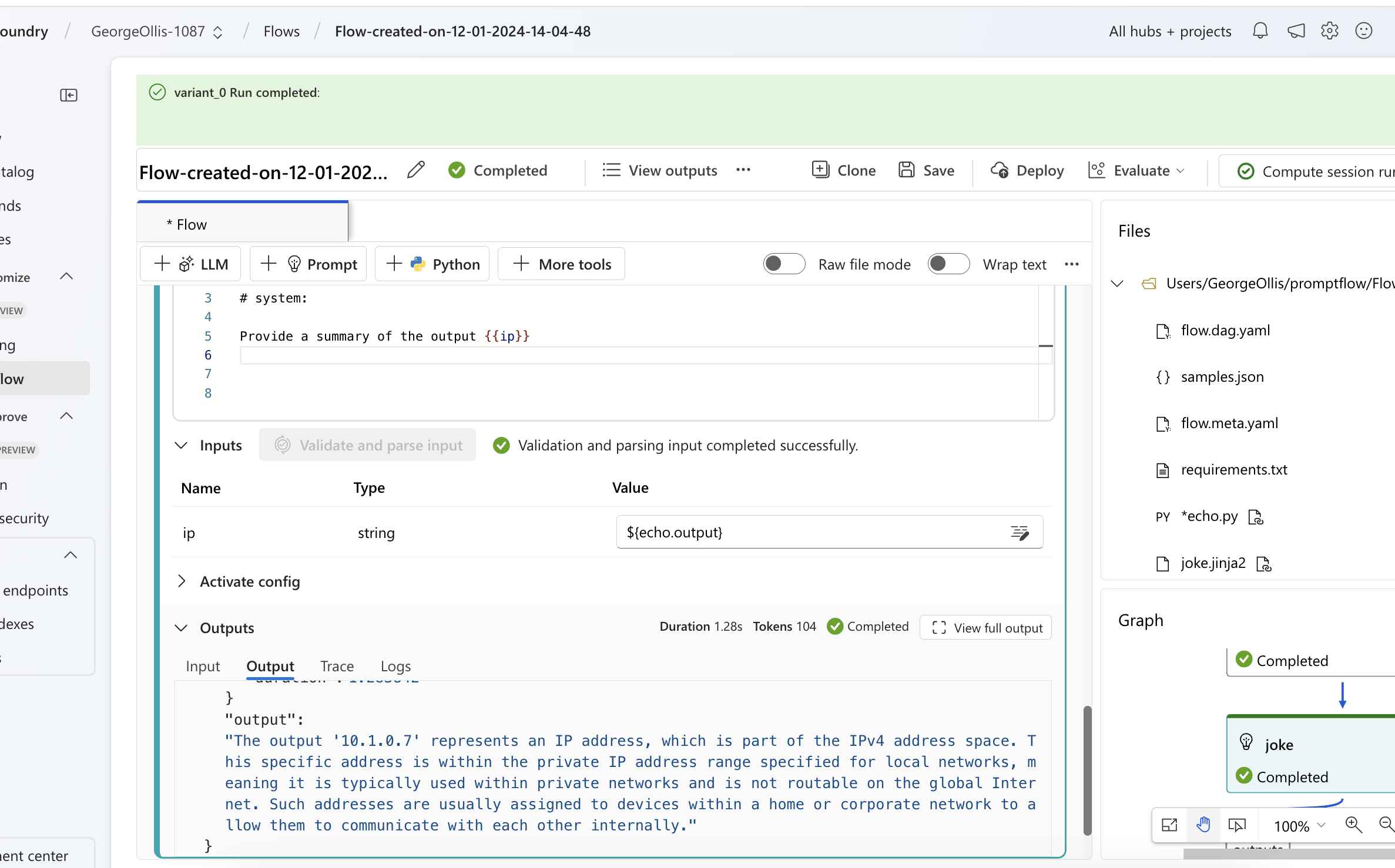 So, how did I test this? Surprisingly, I used PromptFlow on my provisioned compute instance, which allows you to run custom Python code. I could do a DNS query and see the private IP address of the Azure AI Service resource.