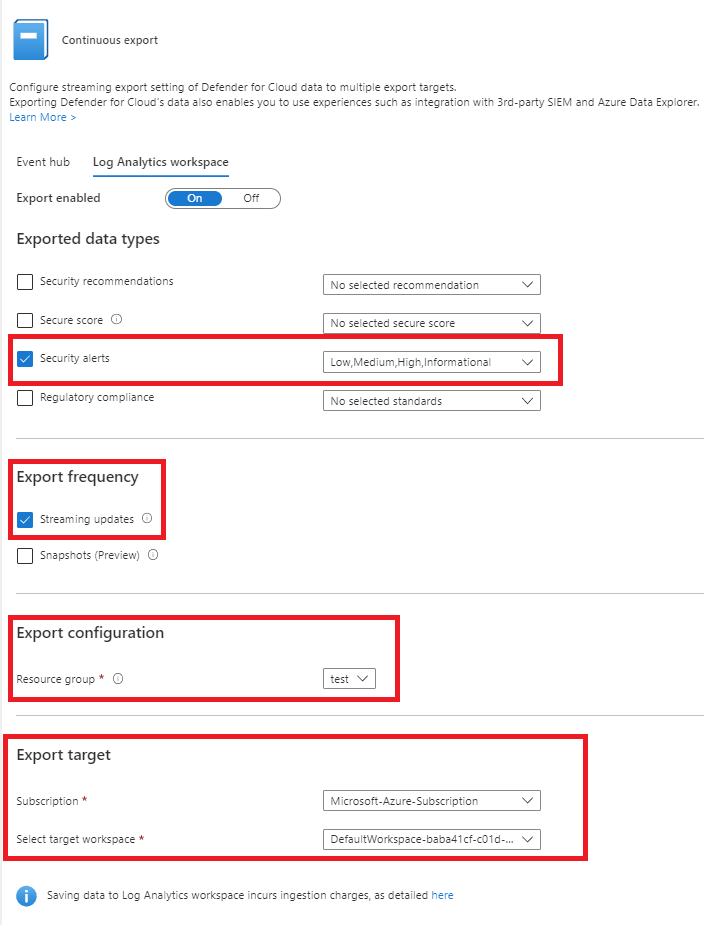 To export these notifications to a Log Analytics Workspace, select the continuous export settings on the same tab.