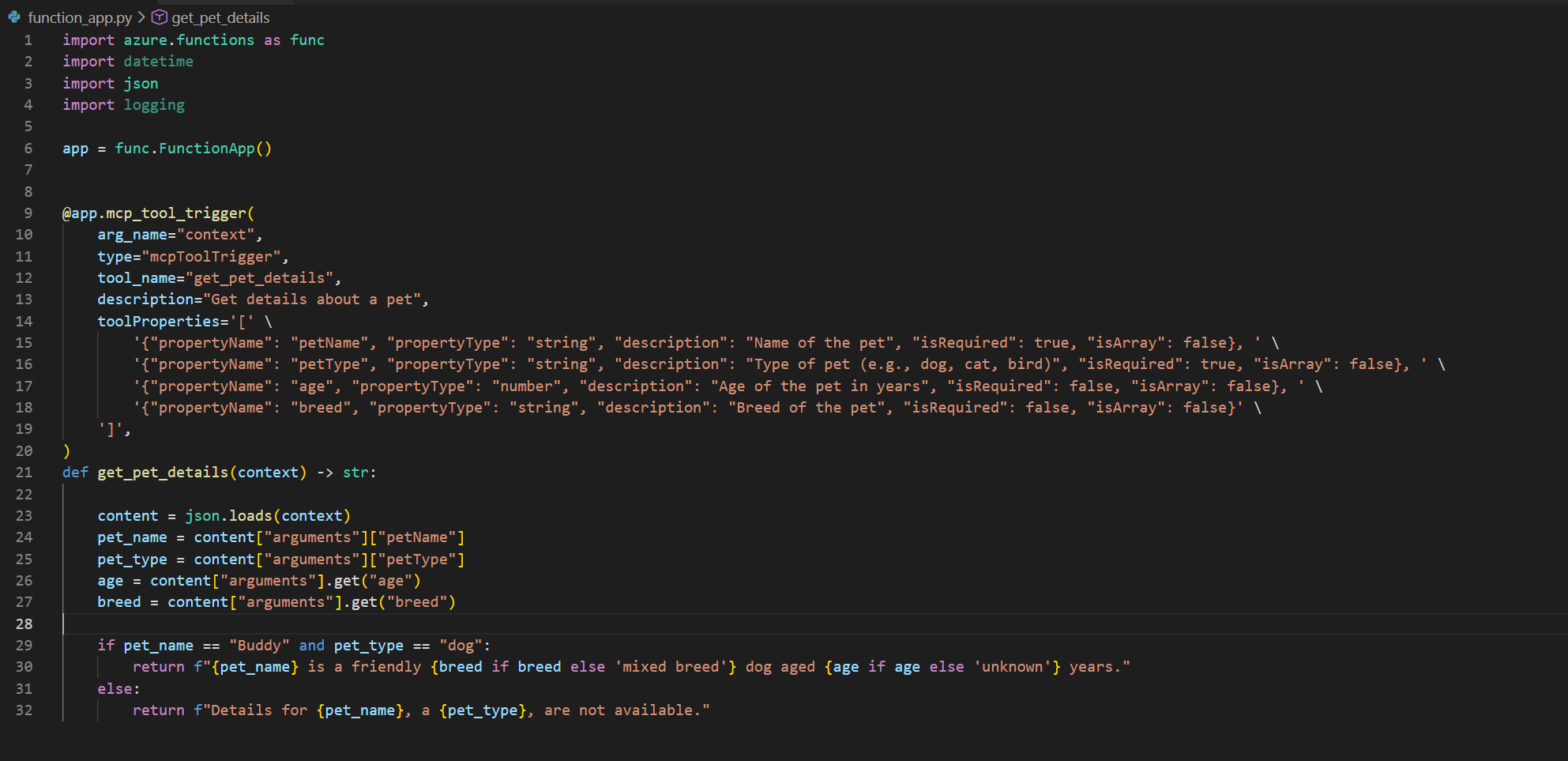 In our basic example, we will be exposing a single tool called get_pet_details. Which looks like this:
