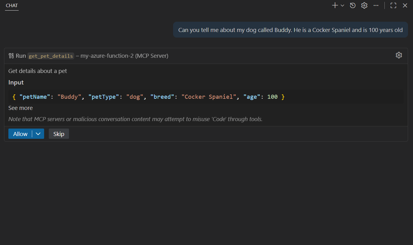 get_pet_details. This tool will take in properties such aspetNameandpetType. - Run the MCP server locally on localhost and interact with the tool in Visual Studio Code.