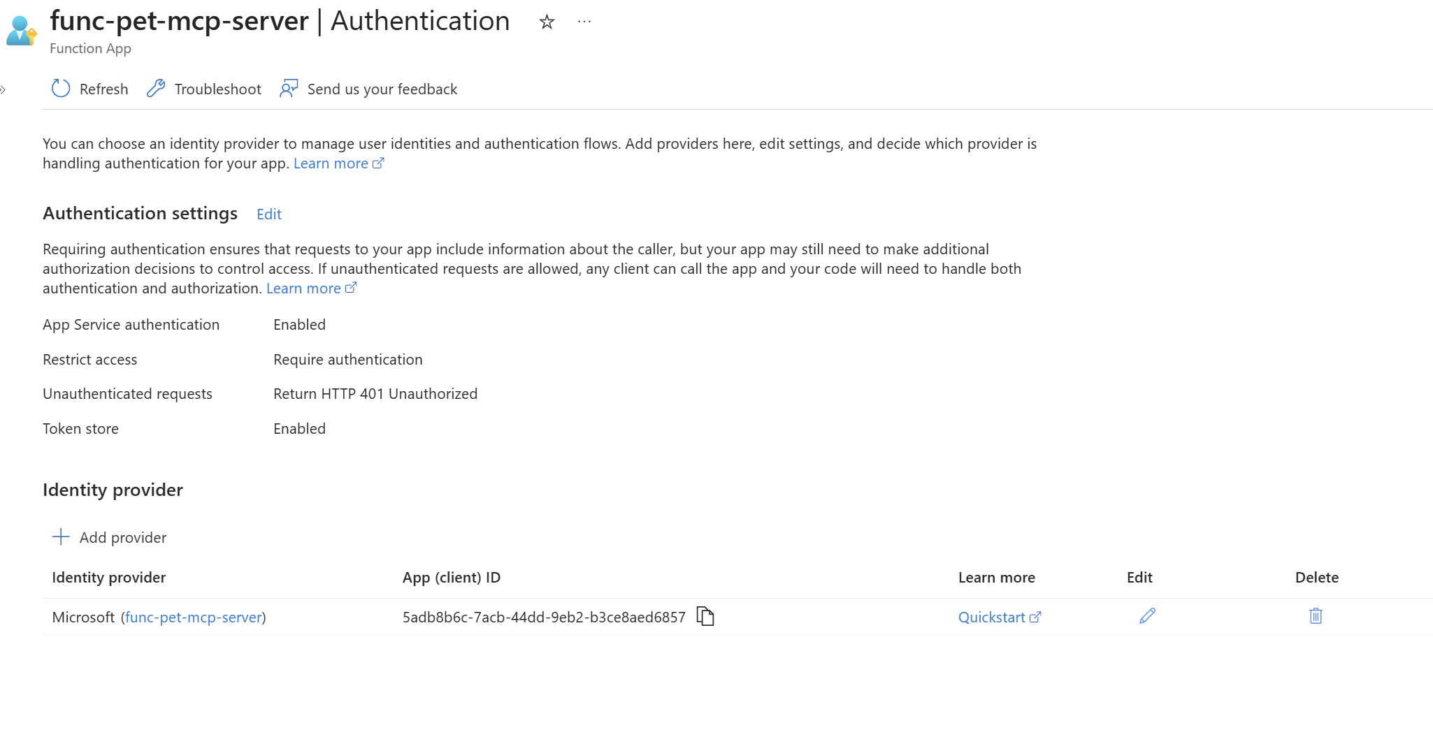 Since the Azure Function is already deployed, you can proceed to configure it. Enable Microsoft authentication from the authentication blade.
