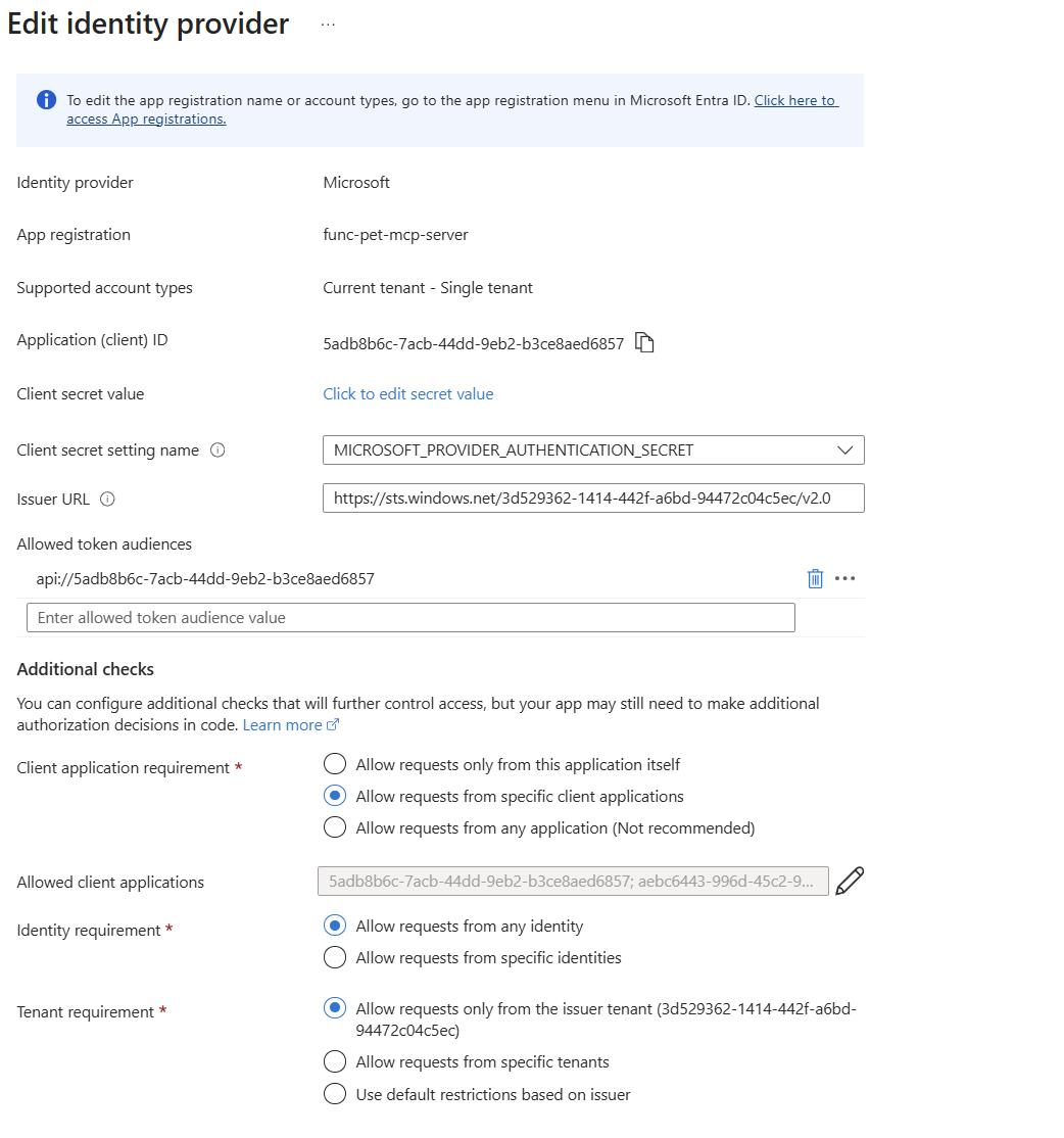 - Deploy the MCP server to Azure. At this stage, we will enable Microsoft Entra ID authentication on the MCP server and specifically allow only the Visual Studio Code client to interact with the tool.