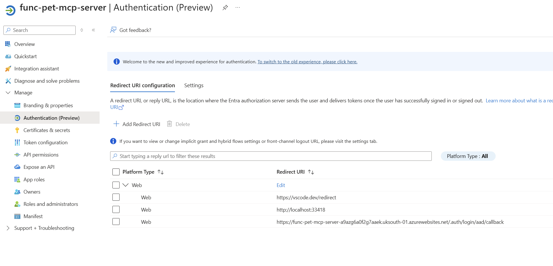 Now, go to the app registration that represents your Azure Function. Add the following redirect URIs.