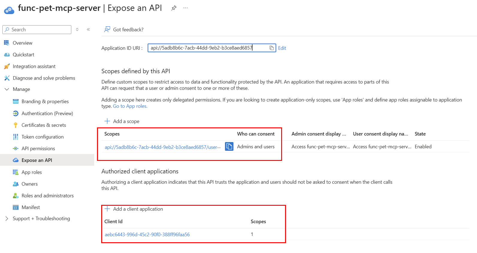 - Go into Expose an API. An existing scope should already exist. Copy this, as we will need it shortly. Again, add the Visual Studio Code Client ID for authorised clients. This means that the API (MCP server) in this case trusts the application and will not ask for consent when calling it.