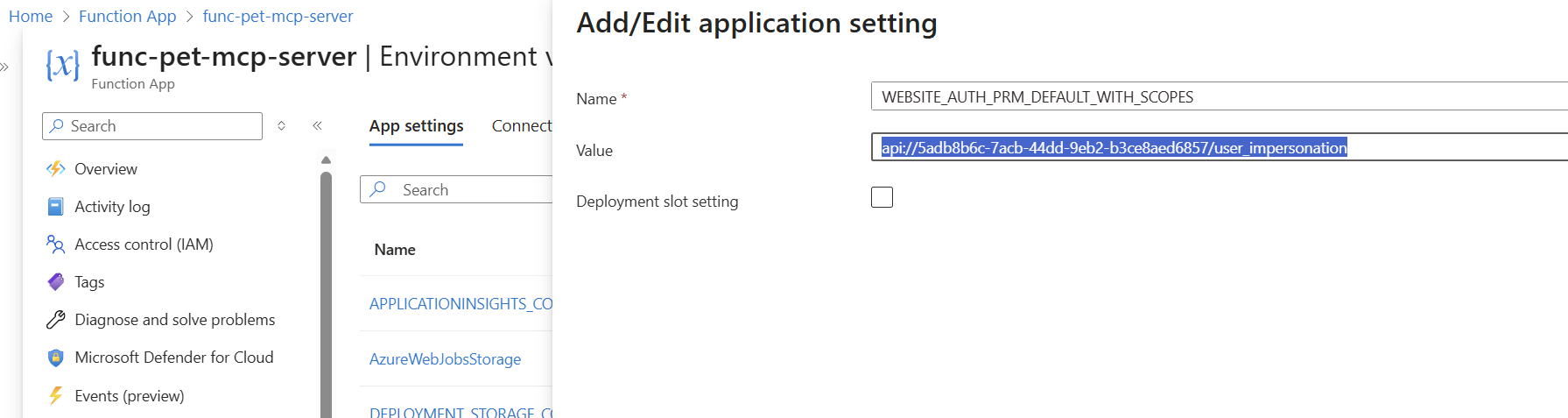 WEBSITE_AUTH_PRM_DEFAULT_WITH_SCOPES = The API scope you just copied. In my example: api://5adb8b6c-7acb-44dd-9eb2-b3ce8aed6857/user_impersonation