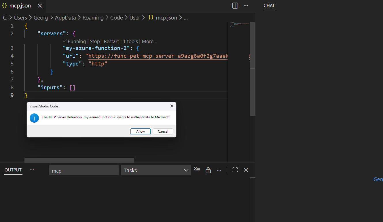 When deploying to Azure, the default configuration is that the extension generates an API key, which is required when interacting with your MCP server. So our MCP User Configuration would look something like this.
